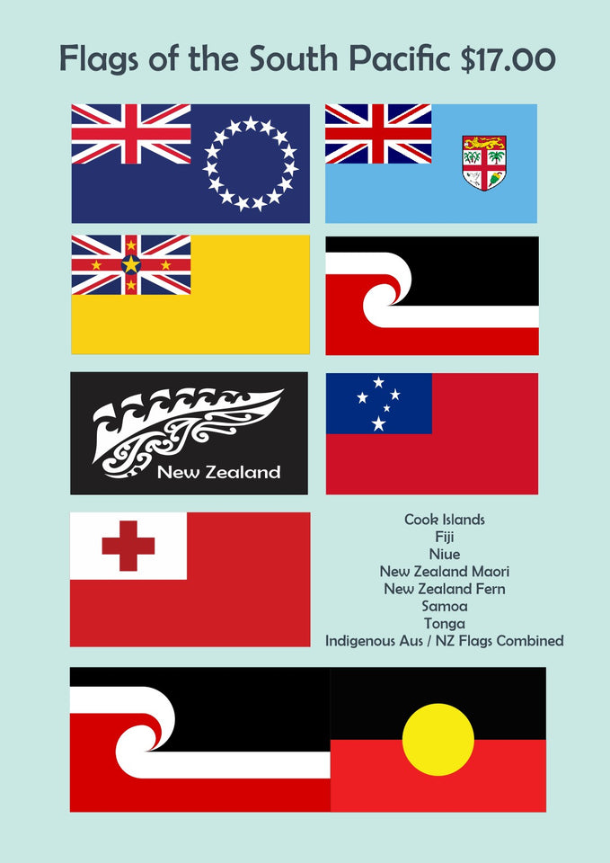 Flags of the South Pacific pays respect to our Brothers and Sisters of the South Pacific and including a combined flag in recognition of our Indigenous Brothers and Sisters of Australia and New Zealand.
